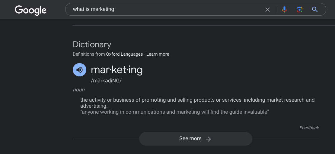 According to Google search, “marketing” is the activity or business of promoting and selling products or services, including market research and advertising.